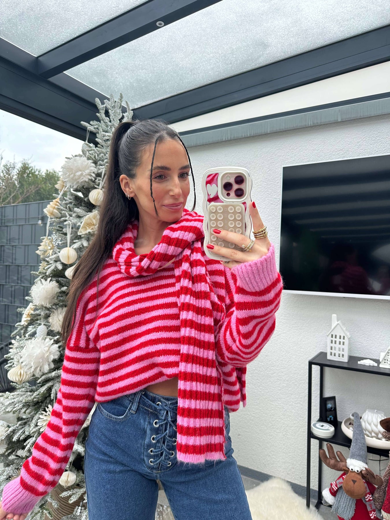 Weicher Strickpullover mit passendem Schal im Streifenlook für einen warmen, auffälligen Winter-Style.